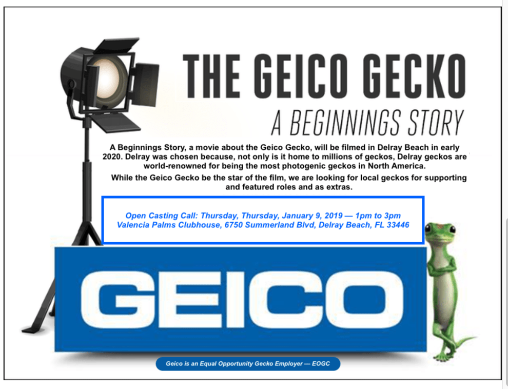 One last tip: show business is tough and every little edge helps. So, after collecting your geckos, and recognizing that preparation is key to a successful audition, you might want to enroll a few of your most promising geckos in the Stella Adler Gecko Conservatory (SAGC) which, in anticipation the film’s Delray shooting location, just opened in downtown Delray Beach and is offering a one-day audition prep course.