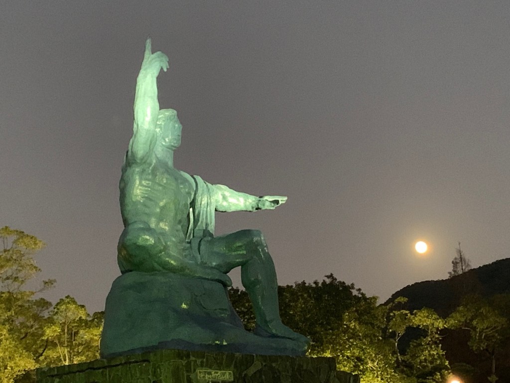 Peace Statue by Seibo Kiamura at Nagasaki Peace Park. “The right hand indicates the threat of nuclear weapons, the left hand symbolizes peace and the closed eyes expresses prayerfulness for those who are victims of war.