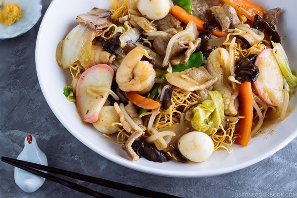 But, beyond the sites and history, perhaps the best part of our Nagasaki visit was to meet, and share a meal with, Kyoko’s cousin, Michiko Kaneko, and her family. The centerpiece of the meal was sara udon, also known as Nagasaki noodles and sometimes called “chamen.” (Sounds a bit like “chow mein” – well it resembles that ubiquitous Chinese dish. Why? Because, remember, Nagasaki was Japan’s window to the outside world, and that outside world included China and its food; ramen and gyoza are also Japanese dishes of Chinese origin.