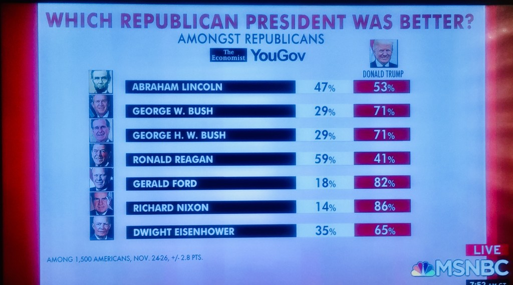 “The Economist/YouGov survey of 1,500 adults asked Democrats, Republicans and independents to compare Trump to seven other GOP presidents, including Lincoln, Richard Nixon and both George Bushes.