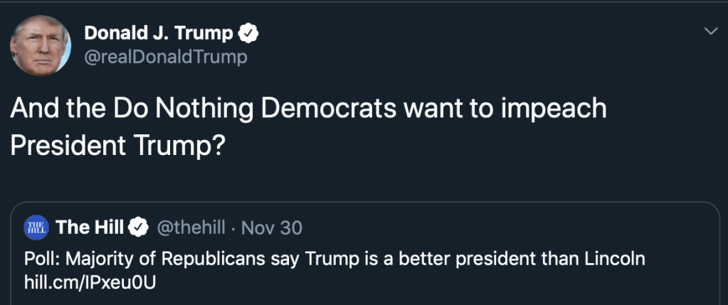 “‘And the Do Nothing Democrats want to impeach President Trump?’ he tweeted over a link to a news story about the stunning results, which found that 53% of GOP voters prefer Trump, while 47% favor Honest Abe.