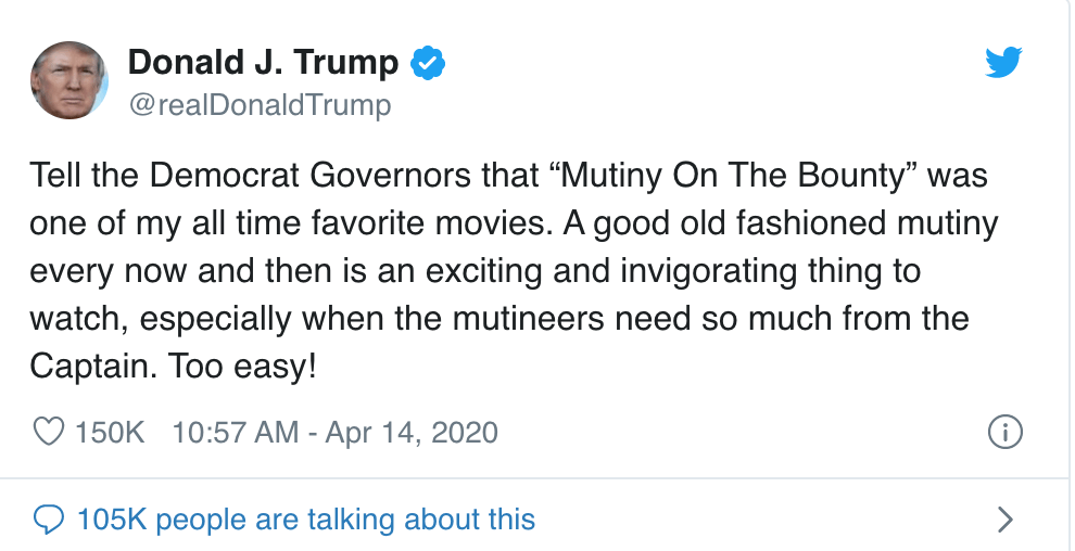 “Tell the Democrat Governors that “Mutiny On The Bounty” was one of my all time favorite movies. A good old fashioned mutiny every now and then is an exciting and invigorating thing to watch, especially when the mutineers need so much from the Captain. Too easy!”