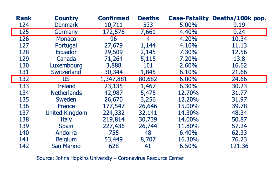 “I think one of the things we’re most proud of is, this just came out — deaths per 100,000 people, death,” Trump said. “So deaths per 100,000 people — Germany and the United States are at the lowest rung of that ladder. Meaning low is a positive, not a negative. Germany, the United States are the two best in deaths per 100,000 people, which frankly, to me, that’s perhaps the most important number there is.”