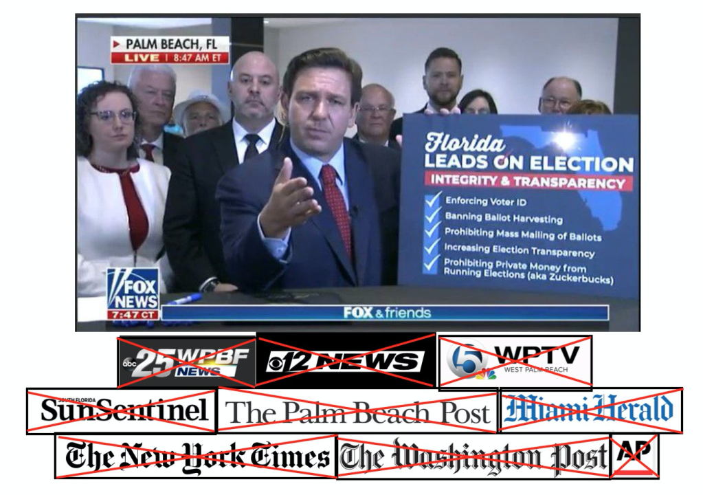 (By the way, in case you’re rubbing your eyes after reading “broadcast exclusively by Fox News,” stop rubbing. Yes it’s true. The only media outlet allowed to cover DeSantis’ historic affront to democracy was Fox News. Apparently, all the so-called “fake news outlets” including all Florida local broadcast stations not affiliated with Fox, were barred entry. Guess Ronnie didn’t want to take any tough questions.)