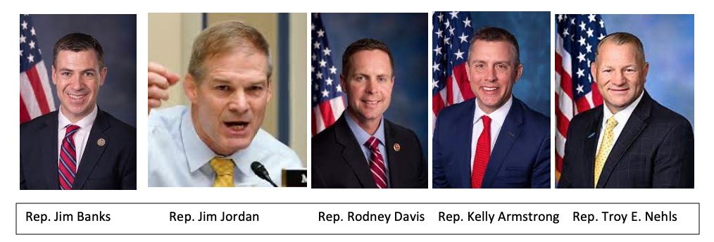 The lawmakers are Reps. Jim Jordan (Ohio), Jim Banks (Ind.), Rodney Davis (Ill.), Kelly Armstrong (N.D.) and Troy E. Nehls (Texas).