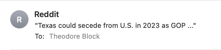 The email was from Reddit. Now, full disclosure, I have no idea what Reddit is. And while I’m sure I’ve received emails from Reddit before, I’ve never opened one. Until now. Why? After reading the subject line, “Texas Could Vote to Secede From U.S. in 2023 as GOP…,” I had to read more.