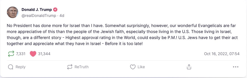 I know this will get me into trouble with some, but I’m going to say it anyway: How any American Jew can vote for Trump or any of the racist, anti-Semitic MAGA candidates around the country he hand-picked and is supporting; how any coalition of American Jews can say silent in the fact of blatant anti-Semitism by two public figures, one of whom is the former President of the United States, is beyond my ability to comprehend!