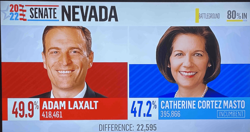 In Nevada, Democratic incumbent Catherine Cortez Masto is about 23,000 votes behind Republican challenger Adam Laxalt (47.2% to 49.9%) in another “too early to call” election. Although Nevada sources are suggesting that most of the missing votes are from Democratic-leaning Las Vegas, whether that suggestion is correct of not, let’s give Nevada to the GOP.