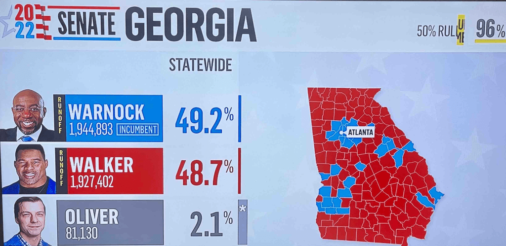 So, unless both Kelly and Cortez Masto win, it will come down to Georgia and the aforementioned Herschel Walker. And, of course, his opponent, the Democratic incumbent, Senator Raphael Warnock. Although Warnock has a slight lead, 49.2% to 48.7% (17,491 votes), to avoid a runoff, Georgia law requires the winning candidate to win at least 50% of the vote. The runoff will occur on December 5. If Warnock wins, the result will be, pending Arizona and Nevada outcomes, a 50-50 split at a minimum and Democratic control So, I guess I’ll have bad ol’ Herschel to kick around (pun intended) for another month while I’m saying to anyone who’ll listen, “How can anyone in their right mind vote for Herschel Walker?”