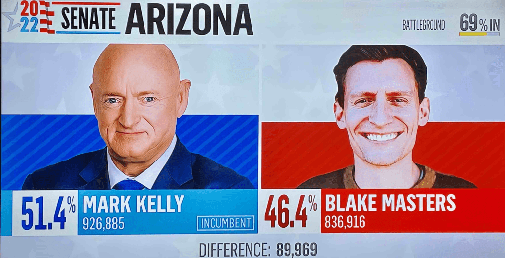 At this point, Arizona is considered too early to call. But incumbent Mark Kelly is leading his AR-15 toting Republican opponent, Blake Masters, 51.4% to 46.4% (89,969 votes). If Kelly prevails the Dems hold the seat and nothing changes.
