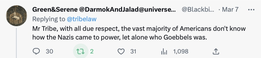 “Mr Tribe, with all due respect, the vast majority of Americans don’t know how the Nazis came to power, let alone who Goebbels was.”
