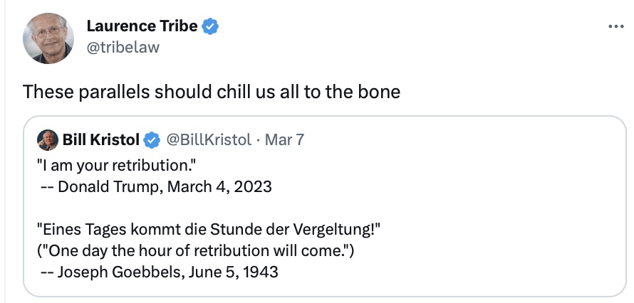 As eminent Harvard Law professor Laurence Tribe said in a retweet of a Bill Kristol post, “These parallels should chill us to the bone.”