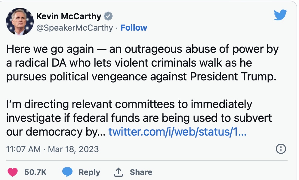 Think about McCarthy’s tweet. Here is a man who is only Speaker and, therefore, third in line to the presidency, because he kowtowed to the MAGA-wing of his caucus, kowtowing again by inserting himself in a legal procedure that has nothing to do with him, calling a duly-elected local DA an abuser of power in a Grand Jury investigation into which McCarthy has no insight. I doubt he, or any or the other Trump acolytes in Congress recognize the irony of McCarthy’s statement about “subvert[ing] our democracy.”