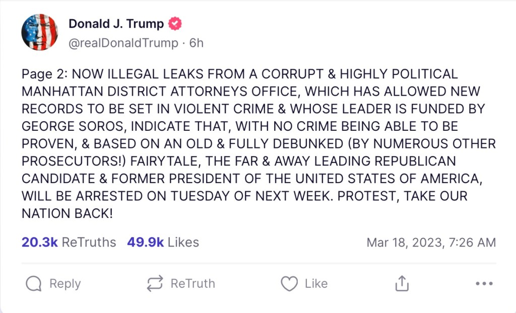 Trump precedes his post about his imminent “arrest” with an ugly, dystopian screed about America.