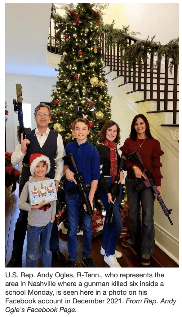 Don’t be foolish, my horrified, rational friends, if you believe that Congress will do anything about this. Not when US Representative Andrew Ogles of Tennessee, who represents the Nashville district where the school is located, said, in a knee-jerk response, “My family and I are devastated by the tragedy that took place at The Covenant School in Nashville this morning. We are sending our thoughts and prayers to the families of those lost. As a father of three, I am utterly heartbroken by this senseless act of violence. I am closely monitoring the situation and working with local officials.”