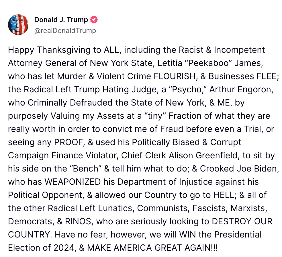 Then, after a week or so of badmouthing the judges, prosecutors and judicial staff involved in his four trials, simultaneously doing what he could to intimidate potential witnesses…all with the protection of the First Amendment’s free speech clause…Trump sent this Thanksgiving “greeting to ALL” on his Truth Social site.