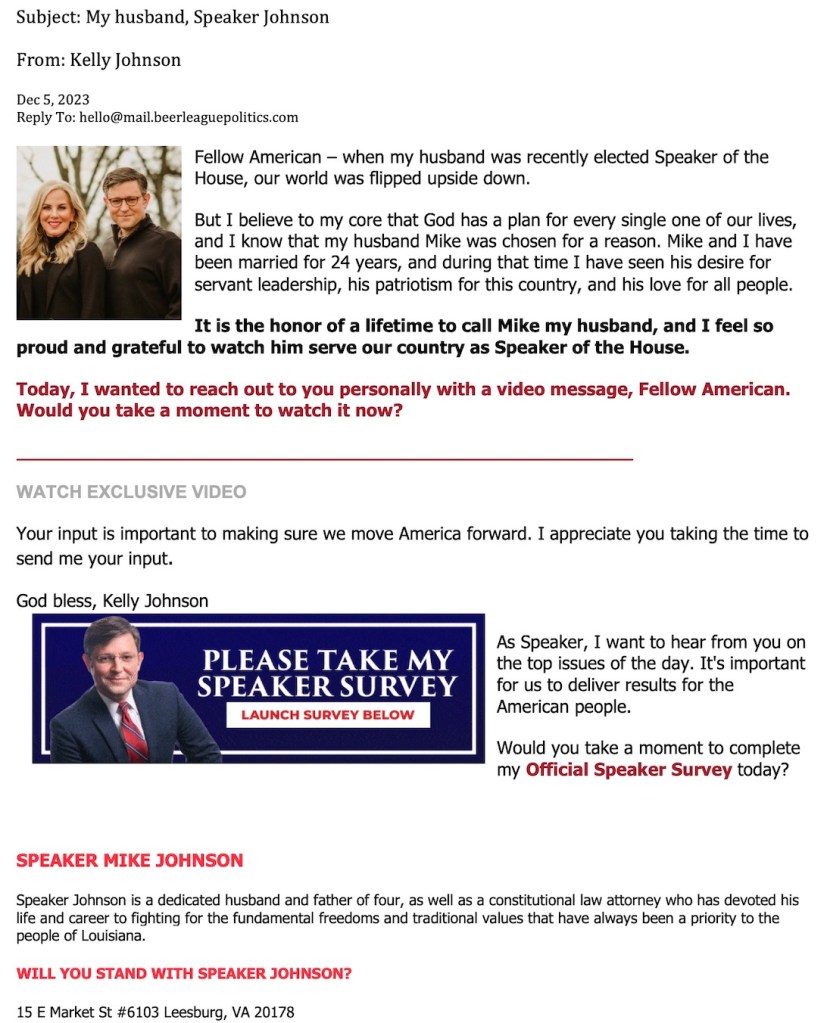 I received an email from someone named Kelly Johnson yesterday. The subject line read, “My husband, Speaker Johnson.” Suffice it to say, the first reaction I had was that MAGA Mike, or his cheerleader wife Kelly, should shop around for a new email provider. Targeting me? What were they thinking? Did they not realize the unintended consequences of sending me this email.
