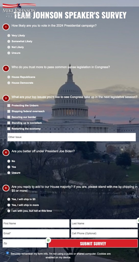 The unintended consequences? Curious about the “Speaker Survey” I clicked on the link and saw, in black and white…or more properly given this is MAGA Mike, red, white and blue…the legislative agenda of the Speaker of the House of the United States of America clearly enumerated in question #3